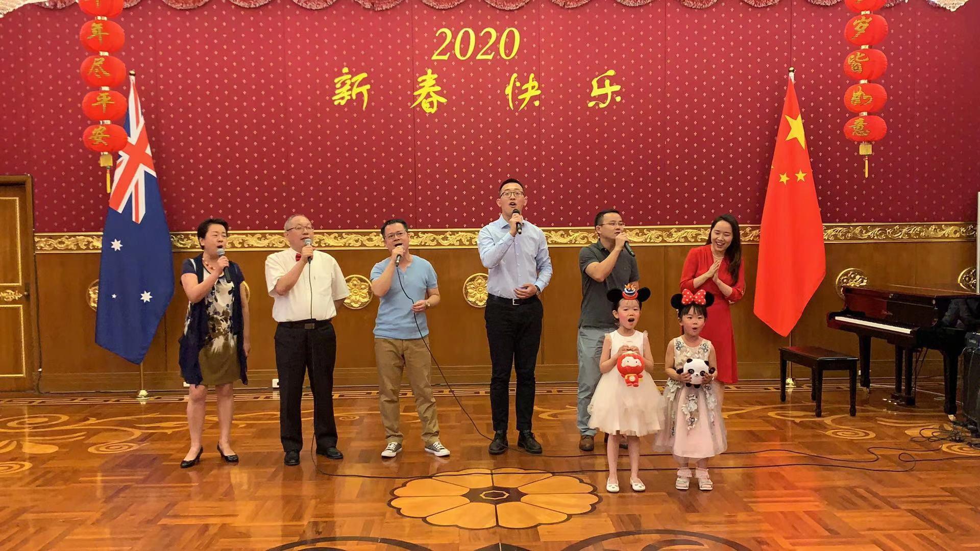中国驻澳大利亚使馆年初举办了庚子年春节联欢晚会,经商处男女老幼上场高歌一曲“明天会更好”,抒发对未来幸福生活的期待,博得满场喝彩。